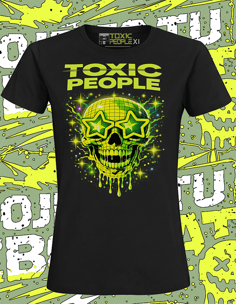 Na přední straně je lebka s disco koulí jako hlavou a výraznými hvězdicovými brýlemi, doplněná o zářící detaily a nápis Toxic People.